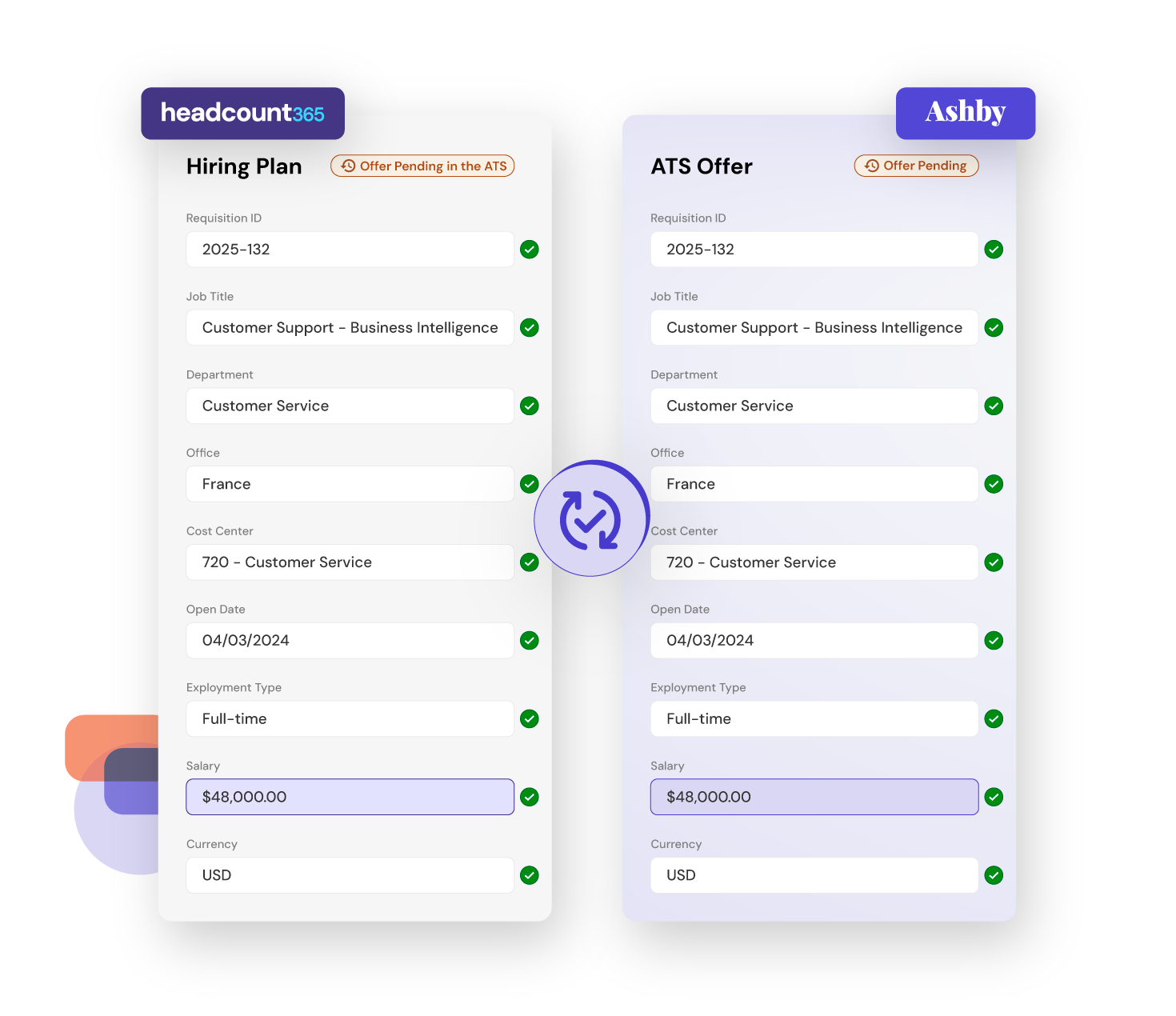 Automatically pull offer details from Ashby and verify them against your approved hiring plan and HRIS. Ensure your offer data is accurate, compliant, and ready for approval—all without manual reconciliation.