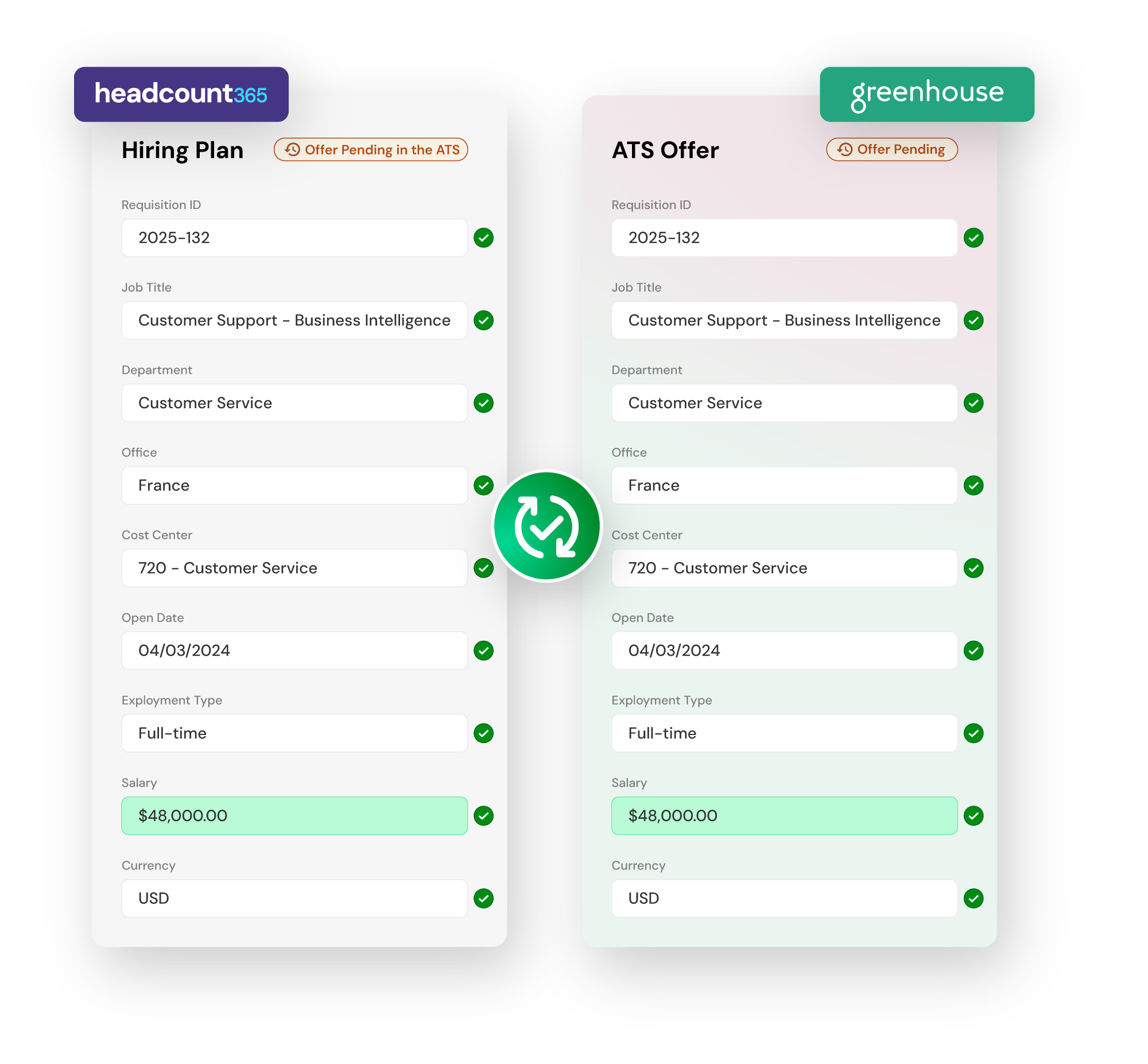 A customizable integration to Greenhouse ATS delivers customers a real-time look at every headcount across every system.