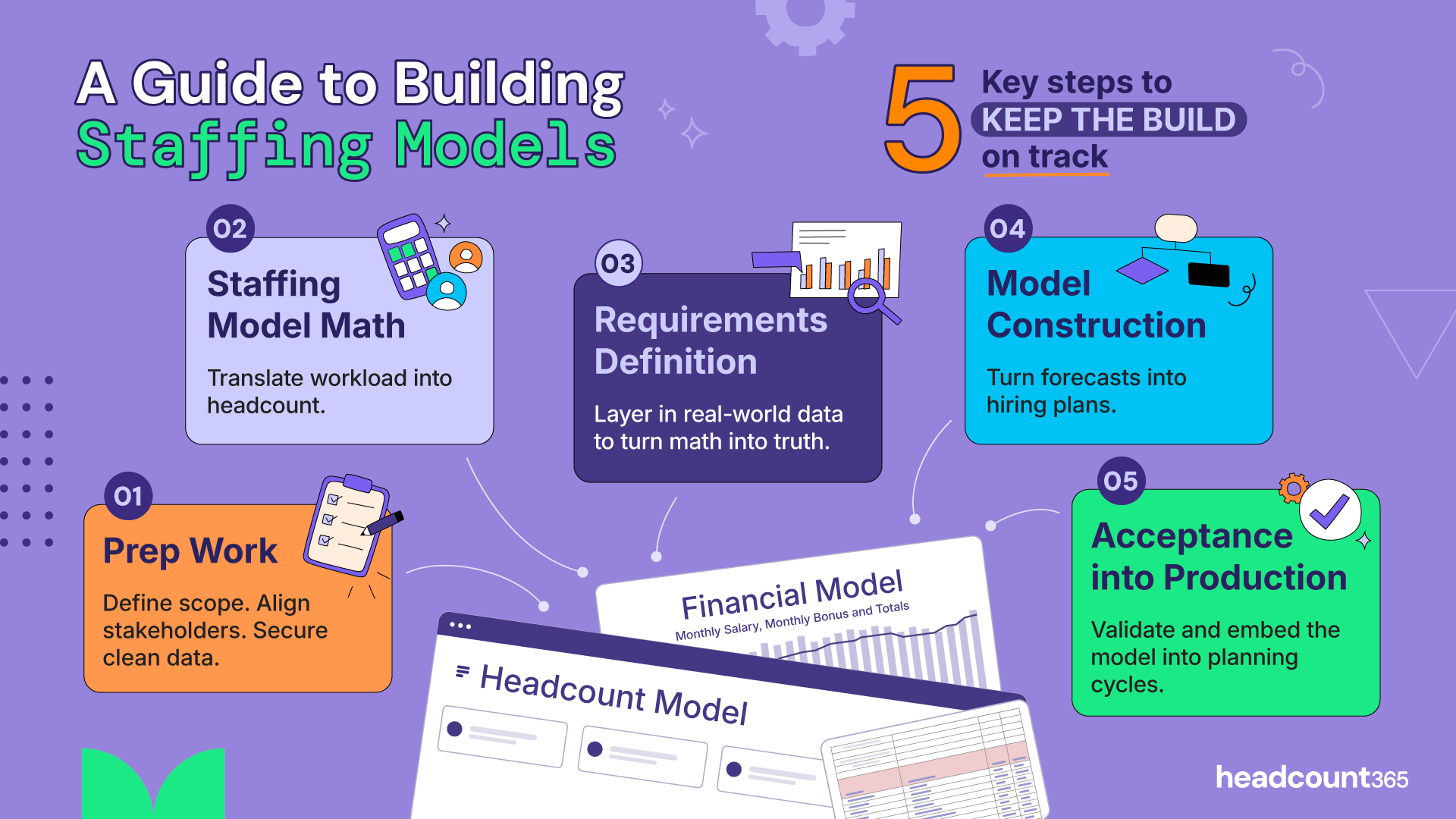 A staffing model defines how work is distributed across an organization. It connects expected workloads, such as revenue per seller, hires per recruiter, or customers per account rep, to projected increases in demand, production, or investment.