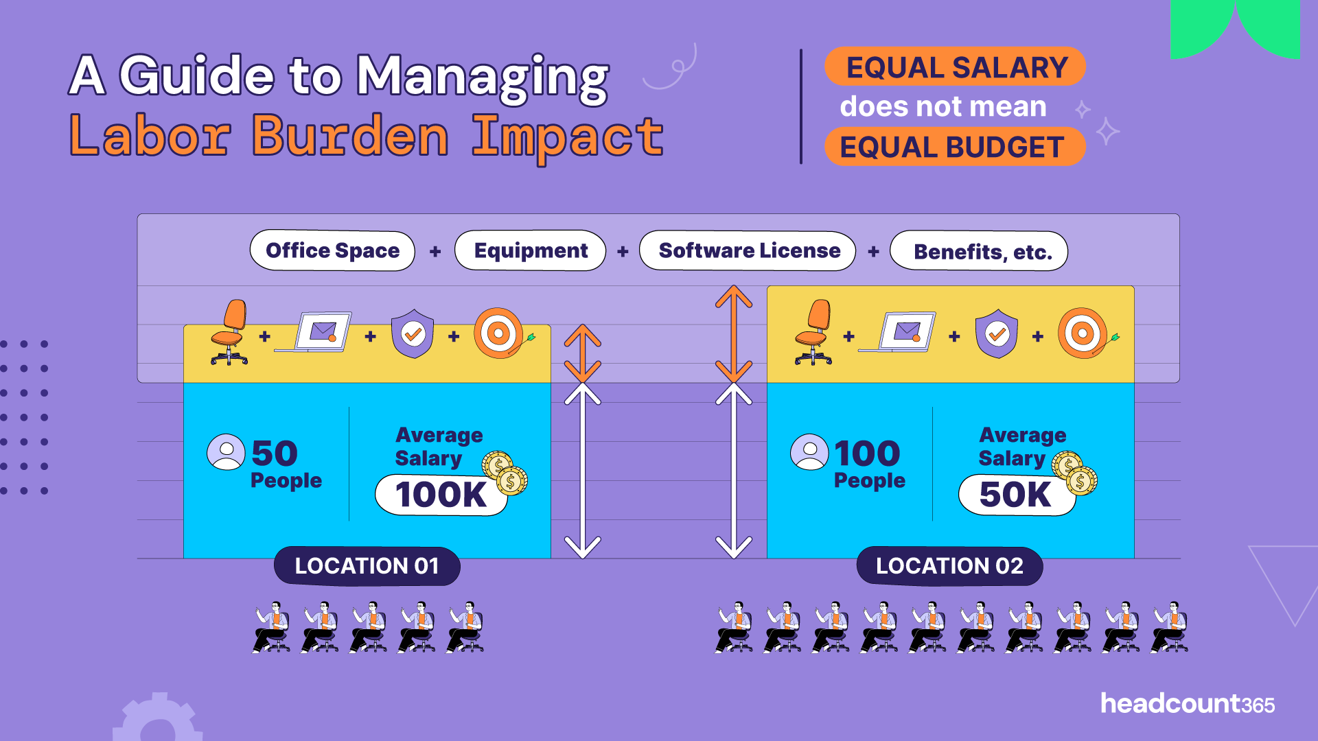Different geographies come with different employment costs — some visible, some not. Lower salary markets may have mandatory benefits, social tax obligations, or legal costs that offset initial savings. Domestic remote employees may also trigger additional stipends or IT support. Burden should reflect the full cost of employment by location, not just salary.