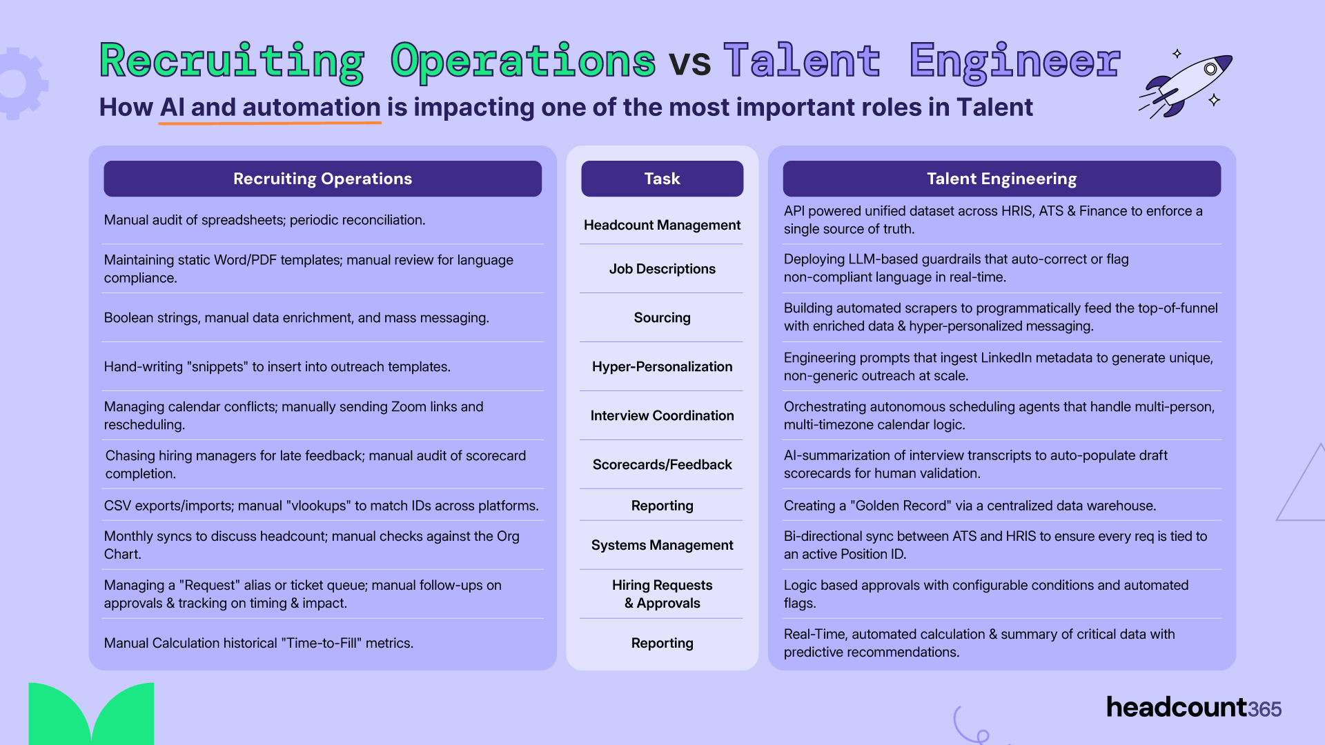 For years, Recruiting Operations (RecOps) has been the steward of the hiring process. As the stack becomes more complex, the need for automation, data integrity & process efficiency between Finance, HR, and Recruiting becomes mission-critical, and a new role has emerged: The Talent Engineer.